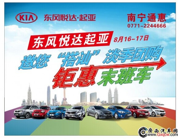 八月,南寧依舊炎熱,大地就像蒸籠一樣,熱得使人喘不過氣來,但是此時東風悅達起亞就像是和老天爺唱反調(diào)似的,優(yōu)惠幅度蹭蹭的往上漲,讓每位想購車的客戶心花怒放。不過大多數(shù)朋友都覺得后期的優(yōu)惠幅度更大。其實不然,8月已經(jīng)來了,9月還會遠嗎?您覺得旺季還會有這樣大的優(yōu)惠幅度嗎?請跟緊南寧通惠起亞的腳步,趕上2014淡季鉅惠團購末班車,讓南寧通惠起亞在廣西綻放,讓心不留遺憾、讓身得到清涼,讓生活每天加點油!好劇不等人!起亞淡季鉅惠團購末班車將于8月16-17日(星期六、星期天)在南寧通惠起亞展廳火熱開播,您還在猶豫什么呢?為了10月1號能夠帶著自己家人或者朋友去自駕游,趕快加入我們吧!詳詢東風悅達起亞南寧通惠4S店:0771-2244 666,地址:南寧市白沙大道69號(白沙友誼立交旁)。
