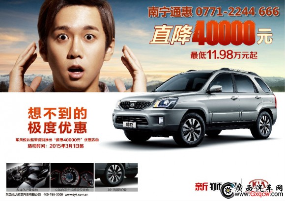 SUV車市的又一輪激烈混戰(zhàn)已經(jīng)拉開序幕!日前,東風悅達起亞新獅跑直降4萬,只要11.98萬元起。也就是說,現(xiàn)在只要自主品牌的價格,就能買到優(yōu)勢“混血”的合資品牌汽車啦!詳詢東風悅達起亞南寧通惠4S店24小時銷售熱線:0771-2244 666 ,地址:南寧市白沙大道69號(白沙友誼立交旁)。