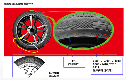 此次錦湖召回相關的東風悅達悅達起亞車輛為賽拉圖和一部分銳歐車輛,包括總7種DOT中的3個,東風悅達起亞的召回范圍(賽拉圖CO 4008、賽拉圖CO 0909、銳歐 CO 0111)請參考國家質量監(jiān)督檢驗檢疫總局(http://www.aqsiq.gov.cn/)公布的召回范圍(CO 2208、CO 4008、CO 0509、CO 0909、CO 2410、CO 2910、CO 0111)來判斷輪胎,,輪胎召回的實施從4月15日開始。