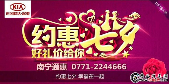 七夕,一個(gè)濃情蜜意的日子,為了讓甜蜜的約會(huì)更加完美、讓出行更加便捷、讓彼此更加親密,8月22日(星期六)東風(fēng)悅達(dá)起亞南寧通惠4S店將舉行七夕“價(jià)給你”團(tuán)購(gòu)會(huì)活動(dòng)詳詢(xún)東風(fēng)悅達(dá)起亞南寧通惠4S店24小時(shí)銷(xiāo)售熱線:0771-2244 666 ,地址:南寧市白沙大道69號(hào)(白沙友誼立交旁)。