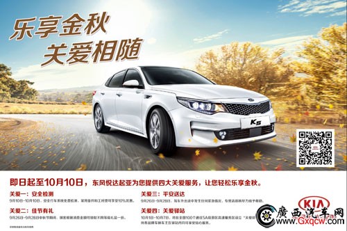 金秋9月,中秋節(jié)、國慶節(jié)接踵而至,無論是走親訪友,還是休閑旅游,自駕已經(jīng)成為越來越多人優(yōu)先的出行方式。面對節(jié)假日不斷增長的用車需求,東風悅達起亞特別啟動“樂享金秋 關(guān)愛相隨”金秋關(guān)愛服務(wù)月活動,以專業(yè)服務(wù)保障用戶出行安全,以真誠溫情相伴一路暢行。詳詢東風悅達起亞南寧通惠4S店24小時售后熱線:0771-2244 669 ,地址:南寧市白沙大道69號(白沙友誼立交旁)。