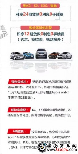 10月1日至11月30日,“雙免”金融政策優(yōu)惠再次來襲!活動期間,凡進(jìn)店購買K2、K3、K3S、智跑車型即可尊享24期“0利息0手續(xù)費(fèi)”禮遇;購買全系其他車型還可享受12期“0利息0手續(xù)費(fèi)”特別優(yōu)惠(秀爾、賽拉圖、銳歐除外),汽車生活從此觸手可及。