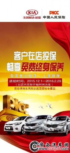 自12月1日起,在東風悅達起亞南寧通惠店購買K3/KX3/K5的新車客戶,并在店內投保中國人保財險車商渠道產品(不含電網銷產品)的消費者;自活動開始之日起第二年及之后的年度仍選擇在原出單店內續(xù)保的消費者,只需同時投保交強險、車損險、商業(yè)三者險(責任限額50萬及以上)等3個及以上險種的客戶,即可享受保險期間內投保專營店提供的機油、機濾終身免費基礎保養(yǎng)服務。(活動詳情請咨詢南寧通惠起亞4S店)