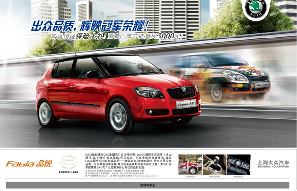 上海大眾年斯柯達品牌年度累計銷量突破20萬輛,完美收官!同時為慶祝Fabia晶銳成功衛(wèi)冕2010年度CRC大賽1600cc組年度總冠軍,上海大眾斯柯達桂林上源4s店同步推出:Fabia晶銳炫酷旅行版!全新酷炫版晶銳登場,運動行李架、魔幻天使眼、動感鋁合金輪轂、再加全套真皮!超值價只售:8.29萬!運動時尚的外表,超強的動力,Tiptronic六速手自一體變速箱,標配5星安全保護裝置,彰顯無窮魅力!