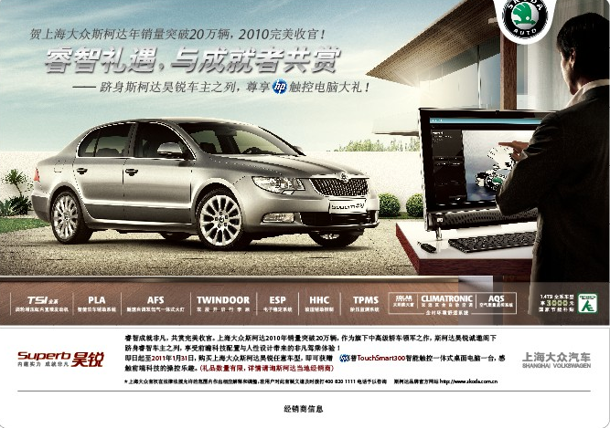 即日起至2011年1月31日,購買上海大眾斯柯達昊銳任意車型,即可獲贈hp惠普TouchSmart300智能觸控一體式桌面電腦一臺,感觸前端科技的操控樂趣。(禮品數(shù)量有限,詳情請詢桂林上源斯柯達:0773-2635280)