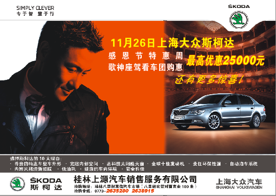 (上海大眾斯柯達(dá)桂林4S店)上海大眾斯柯達(dá)品牌汽車、汽車零配件、汽車用品的銷售及售后服務(wù),二手車交易等。
