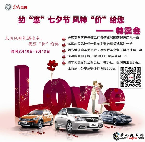 東風(fēng)風(fēng)神南和順專營(yíng)店,8月10-13日推出七夕相遇風(fēng)神,我要“價(jià)”給你特賣惠活動(dòng)報(bào)名開始啦!全系車型到店有禮,下訂有驚喜!報(bào)名熱線:0771-3212003
