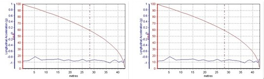 注:橫坐標(biāo)為時(shí)間,單位為S(秒)圖中紅色曲線表示車輛速度對應(yīng)左側(cè)縱坐標(biāo),單位為:km/h(公里/小時(shí))。藍(lán)色色曲線表示車輛加速度對應(yīng)左側(cè)藍(lán)色縱坐標(biāo),單位為:G(重力加速度)