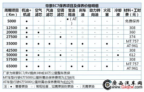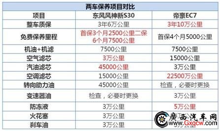 東風(fēng)風(fēng)神新S30/帝豪EC7保養(yǎng)項目及保養(yǎng)價格對比