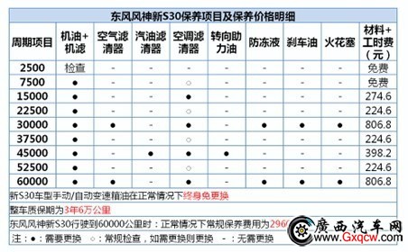 東風(fēng)風(fēng)神新S30整車質(zhì)保為3年或6萬公里,廠家贈送2次免費(fèi)保養(yǎng),首保3個月2500公里,不換機(jī)油,二保6個月7500公里,換機(jī)油。以后每隔6個月7500公里保養(yǎng)一次。新S30全系車型變速箱油在正常情況下終身免更換,正常情況下行駛6萬公里所需保養(yǎng)總費(fèi)用為2960.2元。