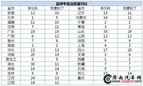 東風(fēng)風(fēng)神新S30/帝豪EC7全國專營店數(shù)量對比