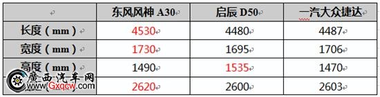 對比目前兩款熱銷車型,啟辰D50和捷達,即可對A30的大空間一目了然。