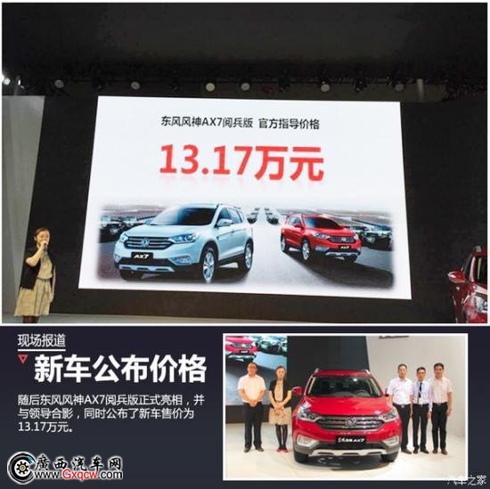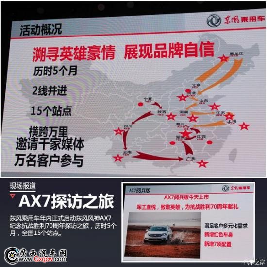 去年11月,東風(fēng)風(fēng)神發(fā)布了旗下首款SUV東風(fēng)風(fēng)神AX7,正式進軍SUV市場。為迎接世界反法西斯勝利70周年,有著濃厚軍工背景的東風(fēng)計劃推出其紀(jì)念版車型。日前,網(wǎng)通社從東風(fēng)乘用車官方獲悉:東風(fēng)風(fēng)神AX7閱兵版正式上市,新車的售價為13.17萬元。值得一提的是,東風(fēng)風(fēng)神AX7閱兵版是在普通版車型基礎(chǔ)上加了7項配置,并增添了象征勝利的紅色車身。
