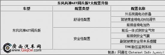 配置方面,東風(fēng)風(fēng)神AX7閱兵版增加了包括外后視鏡電動折疊、駕駛席座椅電動6向調(diào)節(jié)、前排座椅電加熱、前排側(cè)安全氣囊、前后一體式側(cè)安全氣簾、副駕駛席安全帶未系提醒以及TPMS胎壓監(jiān)測系統(tǒng)共7大配置。