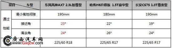 為適應(yīng)復(fù)雜路況行駛,三款車型都有意調(diào)高了底盤,AX7和CS75擁有190mm的最小離地間隙,超越了同級別SUV產(chǎn)品。在接近角和離去角的對比上,長安CS75不占優(yōu)勢。而東風(fēng)風(fēng)神和哈弗H6的表現(xiàn)很強(qiáng)悍。23°的接近角和24°的離去角,使東風(fēng)風(fēng)神AX7從容應(yīng)對面陡坡。