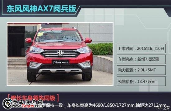 去年11月,東風風神發(fā)布了旗下首款SUV 東風風神AX7,拉開了品牌進軍SUV市場的序幕。隨著今年迎來世界反法西斯勝利70周年,有著軍工背景的東風乘用車計劃推出紀念版車型。日前,網(wǎng)通社從東風乘用車官方獲悉:東風風神AX7閱兵版將于本月10日上市,目前已全面接受網(wǎng)絡預訂,預計售價13.47萬元。值得一提的是,新車在原有基礎上增配7項,并增添了紅色車身顏色。