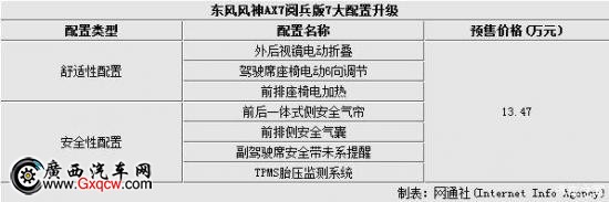 配置方面,東風風神AX7閱兵版增加了包括外后視鏡電動折疊、駕駛席座椅電動6向調節(jié)、前排座椅電加熱、前排側安全氣囊、前后一體式側安全氣簾、副駕駛席安全帶未系提醒以及TPMS胎壓監(jiān)測系統(tǒng)共7大配置。