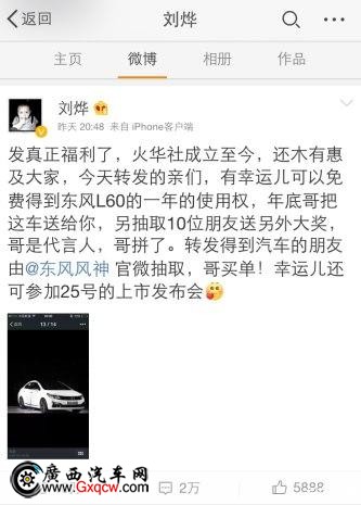 3月17日晚,當(dāng)紅影星、金馬影帝劉燁在其個人官方微博上宣布:他已成為東風(fēng)風(fēng)神L60代言人,而同時轉(zhuǎn)發(fā)其代言微博內(nèi)容的粉絲,將有機(jī)會獲得免費(fèi)使用L60一年的機(jī)會,并將有機(jī)會與其一起參與本月25日舉辦的東風(fēng)風(fēng)神