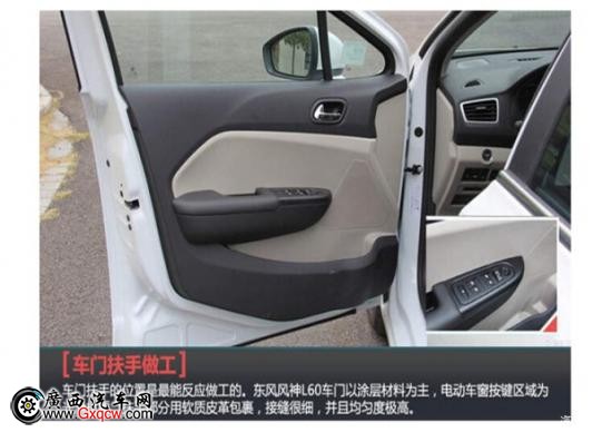 車門扶手的位置是最能反應(yīng)做工的。東風(fēng)風(fēng)神L60車門以涂層材料為主,電動(dòng)車窗按鍵區(qū)域?yàn)楣饣馁|(zhì),扶手部分用軟質(zhì)皮革包裹,接縫很細(xì),并且均勻度極高,看不到明顯的縫隙,也沒(méi)有飛起的毛刺。