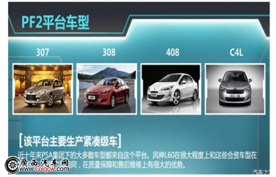 東風(fēng)風(fēng)神L60是由東風(fēng)公司、標(biāo)致雪鐵龍集團(tuán)與神龍公司共同研發(fā)的產(chǎn)品。它所使用的平臺(tái)是基于PSA集團(tuán)的二號(hào)平臺(tái)(PF2),這個(gè)平臺(tái)主要生產(chǎn)緊湊級(jí)車,近十年來(lái)PSA集團(tuán)下的大多數(shù)車型都來(lái)自這個(gè)平臺(tái),包括標(biāo)致307、308、408以及雪鐵龍C4L等。東風(fēng)風(fēng)神L60在很大程度上和這些合資車型在零部件、配置方面相同,在質(zhì)量保障和售后維修上有很大的優(yōu)勢(shì)。