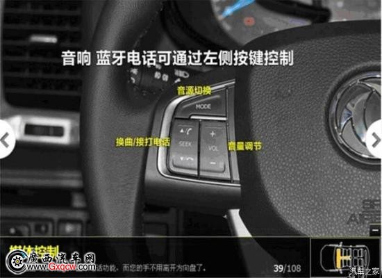 1)方向盤上左側(cè)區(qū)域:為音響、接聽(tīng)電話區(qū)域,具體中英對(duì)比如下
