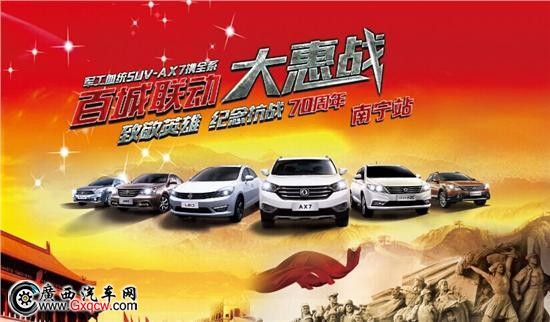 6月27日,東風(fēng)風(fēng)神“致敬英雄 紀(jì)念抗戰(zhàn)70周年 ”—東風(fēng)風(fēng)神軍工SUV-AX7攜全系百城聯(lián)動(dòng)大惠戰(zhàn)即將在南寧拉開(kāi)帷幕。最有誠(chéng)意的獻(xiàn)禮,最熱血的軍工車(chē)型,約你一起致敬英雄!