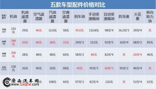 機(jī)油和機(jī)油濾清器作為每次保養(yǎng)都需更換的配件,有著舉足輕重的作用。在機(jī)油方面,五款車型均為半合成機(jī)油,價格上略有些許不同,但沒有拉開差距,。差距*大的要屬自動變速箱油,*高的哈 弗H 6與最低的長 安C S75,價差達(dá)到了92×5-60×3=280元。