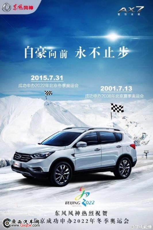 今天,東風(fēng)風(fēng)神和你一起,為祖國干杯!北京申辦2022年冬奧會的成功實(shí)現(xiàn)了奧運(yùn)滿貫夢想,作為**個(gè)同時(shí)成功申辦夏季奧運(yùn)會和冬季奧運(yùn)會的城市,我們的北京,洋溢著滿滿的自豪感。自豪向前,永不止步!民族崛起,你我共行!