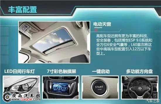 高配車型還擁有更為豐富的科技、安全裝備,包括博世ESP 9.0系統(tǒng)和全方位6安全氣囊等,L60首次將這些中高端車型配置引入12萬以下車型上。此外,其還配備了豪華真皮電加熱記憶座椅、智能鑰匙/一鍵啟動、7寸彩色觸摸屏、車機智能互聯(lián)系統(tǒng)、倒車影像、車載藍牙、EBD電子制動力分配等等豐富、實用的配置。