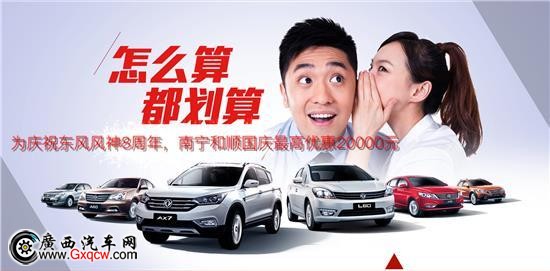 為慶祝東風(fēng)風(fēng)神8周年,南寧和順東風(fēng)風(fēng)神店國慶*高優(yōu)惠20000元!要超高顏值!超大空間!更要超低油耗及超全售后!東風(fēng)風(fēng)神都能滿足您!即日起到10月7日,東風(fēng)風(fēng)神8周年*高優(yōu)惠可達(dá)20000元,機(jī)會不容錯過!