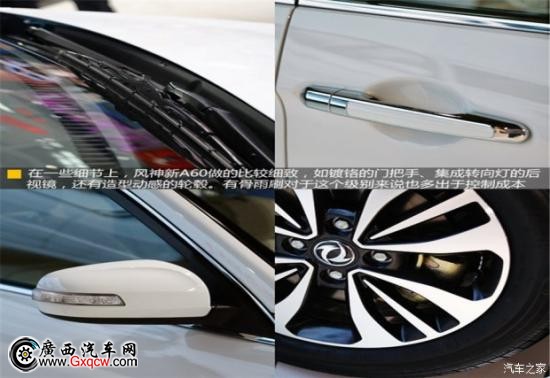 在一些細節(jié)上,風神新A60做的比較細致,如鍍鉻的門把手、集成轉(zhuǎn)向燈的后視鏡,還有造型動感的輪轂。有骨雨刷對于這個級別來說也多出于控制成本。尾部新A60的變化不是很大,但尾燈上倒車燈白色條狀的上移,與鍍鉻橫條形成一整條分隔帶使得車尾變得更加規(guī)整。