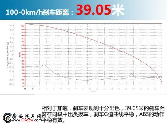 相對于加速,剎車表現(xiàn)則十分出色,39.05米的100-0km/h剎車距離在同級中出類拔萃,這與L60使用的博悅系列輪胎不無關(guān)系。連續(xù)十組剎車測試中,剎車沒有出現(xiàn)熱衰退,剎車G值曲線平穩(wěn),ABS的動作平穩(wěn)有效。與近似平臺的很多車型一樣,由于重量過于集中在前軸前部,急剎車時無可避免的出現(xiàn)點頭現(xiàn)象,但也沒有對急剎時的尋跡性造成影響。