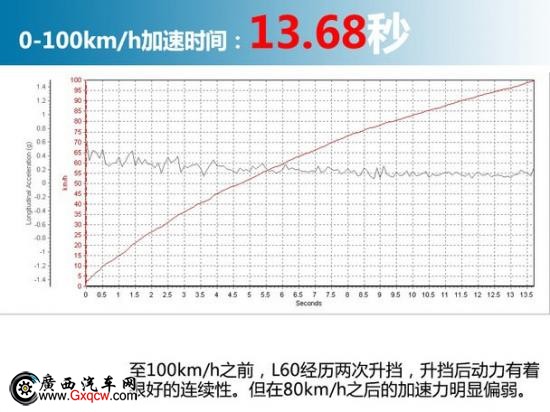 關(guān)掉ESC,按下?lián)鯒U左側(cè)的S鍵,踩住剎車時L60的起步轉(zhuǎn)速可以超過2500rpm,即使這樣也只能讓前輪輕微打滑。這到并不是說發(fā)動機扭矩輸出不行,而是輪胎縱向抓地力實在出色。直至100km/h之前,L60經(jīng)歷兩次升擋,升擋后動力有著很好的連續(xù)性。但在80km/h之后的加速力明顯偏弱,經(jīng)過13.68秒L60時速破百。平順的動力結(jié)合初段較硬的懸掛讓L60的起步姿態(tài)較為穩(wěn)健,沒有前仰后合的表現(xiàn)讓L60急加速時也能照顧乘客的感受。