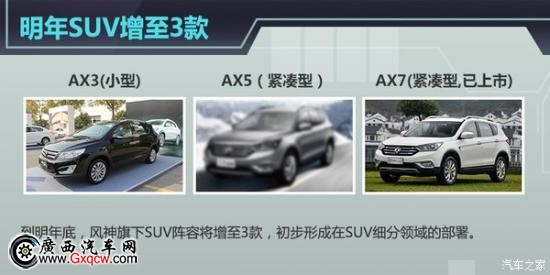 據(jù)悉,今年11月21日,東風(fēng)風(fēng)神定位低于AX7的全新小型SUV——AX3將正式上市;全新緊湊型SUVAX5預(yù)計(jì)將于明年11月登陸市場(chǎng),此外AX7 1.4T車型也將于明年登陸市場(chǎng),滿足用戶對(duì)動(dòng)力總成的不同需求。這意味著到明年底,東風(fēng)風(fēng)神SUV陣容將增至3款,初步形成在SUV細(xì)分領(lǐng)域的布局。
