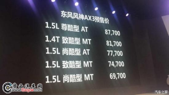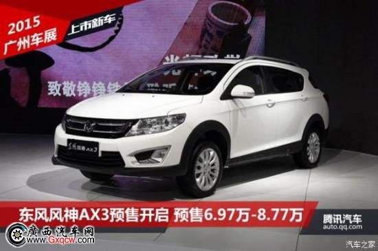 2015年11月20日,東風(fēng)風(fēng)神AX3在廣州國際車展正式公布預(yù)售價(jià),預(yù)售6.97萬-8.77萬元。