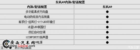 在內飾方面,東風A9將配備多功能真皮方向盤、電動防炫目內后視鏡、冰藍顏色LED氛圍燈、12INFINITI揚聲器等配置,營造舒適的內飾氛圍。按照車型定位,新車將主打公務車市場,車內后排將配備VIP控制功能,可調節(jié)空調、座椅的舒適度,迎合后排“領導”的需求。此外胎壓監(jiān)測、220V電源燈較為常見的配置也將成為東風A9的配備。