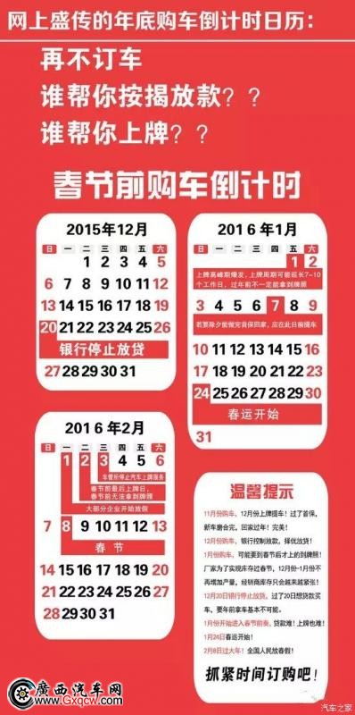 首先來回顧一下網(wǎng)上盛傳的年底購車倒計時表,雖然這一長圖有經(jīng)銷商為著急賣車的煽動性嫌疑,但還是能夠獲得清晰的時間節(jié)點。最終的結(jié)論就是:臨近年底,留給你買車的時間真的不多了!
