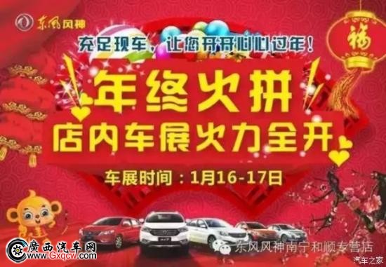東風風神廠家年終感恩鉅惠,感謝您一直來對東風風神的支持與厚愛,首屆店內(nèi)車展即將于2016年1月16日13:30-15:30在科園大道西九路3號南寧和順旗艦店展廳火熱開啟!本次活動將繼續(xù)讓廣大喜歡東風風神的朋友盡享購車之惠,盡獲特價之超值。如果您在前期車展沒有購得愛車,歡迎來店賞車及試乘試駕,讓您輕松擁有,開開心心開車回家過春節(jié)!