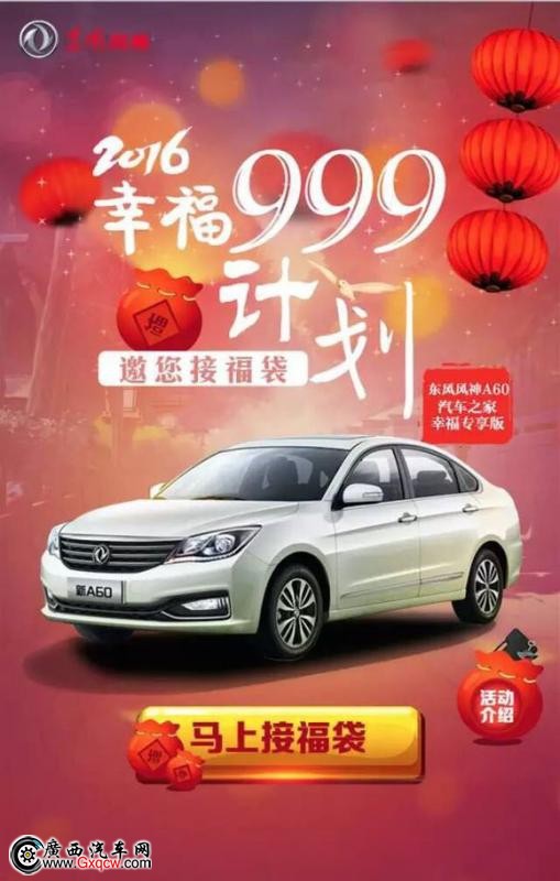 購車四重好禮 讓幸福喜上加喜 源于情人節(jié)的幸福感召,東風(fēng)風(fēng)神與汽車之家聯(lián)合推出新A60汽車之家幸福專享版,為你打造獨(dú)特幸福專享身份,誠意回饋廣大消費(fèi)者,**僅限999臺(tái),現(xiàn)在購車,更有四重好禮,具體時(shí)間和內(nèi)容,詳見汽車之家專題!