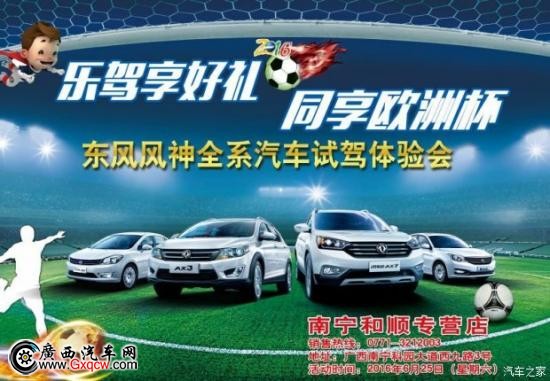 買車去哪兒?買車就去南寧和順專營(yíng)店,6月25-26日樂(lè)享好禮 同賞歐洲杯暨東風(fēng)風(fēng)神全系車型試駕體驗(yàn)會(huì)與您相約,不見(jiàn)不散喲!享不盡的優(yōu)惠,送不完的豪禮等著您!讓您欣喜而來(lái),滿意而歸!您還等什么?地址:南寧市科園大道西九路3號(hào) 咨詢熱線:13481181120