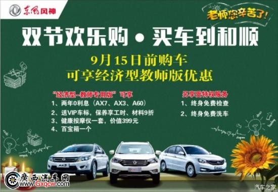 雙節(jié)歡樂購,暢享在風神,東風風神南寧和順專營店推出--教師節(jié)優(yōu)惠購車月&禮獻中秋傾情回饋;活動期間,特別推出“經(jīng)濟型-教師專用版”;