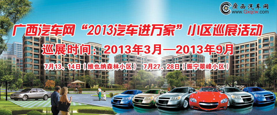 7月13、14日(本周末)下午15時至21時,廣西汽車網“2013汽車進萬家”小區(qū)巡展活動在維也納森林小區(qū)英雄廣場隆重舉行,奔馳、寶馬、奧迪、本田、標致、斯柯達、菲亞特、斯巴魯、奔騰、江鈴、東南汽車等20多款熱銷車型現(xiàn)場同掀“冰點團購狂潮”!